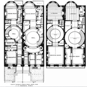 Combined architectural renderings of the front and rear elevations of 424-426 Beacon (1904), by architect Julius A. Schweinfurth; courtesy of the Boston City Archives, City of Boston Blueprints Collection